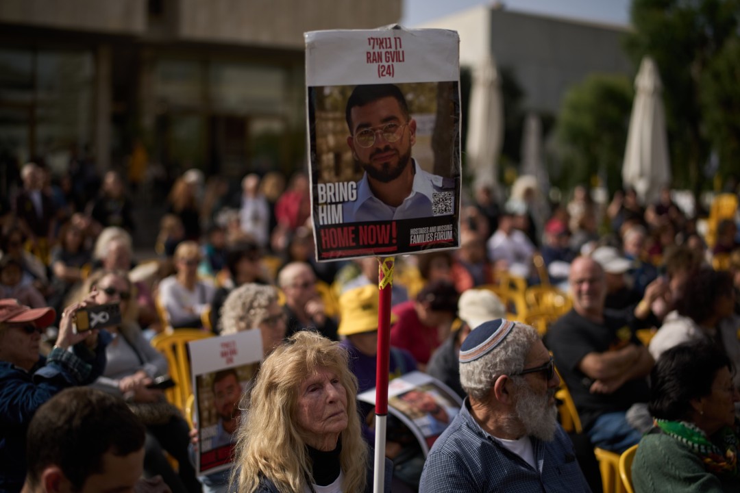 People hold signs with a photo of Ran Gvili, who was killed while fighting Hamas militants during the Oct. 7, 2023 attack and whose body has been held in Gaza ever since, during a rally calling for his return in Tel Aviv, Israel, Friday, Jan. 23, 2026.   (AP Photo/Leo Correa)